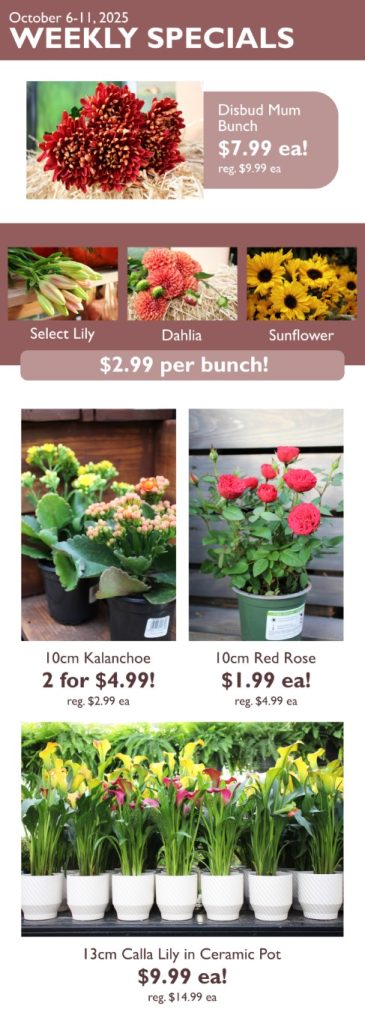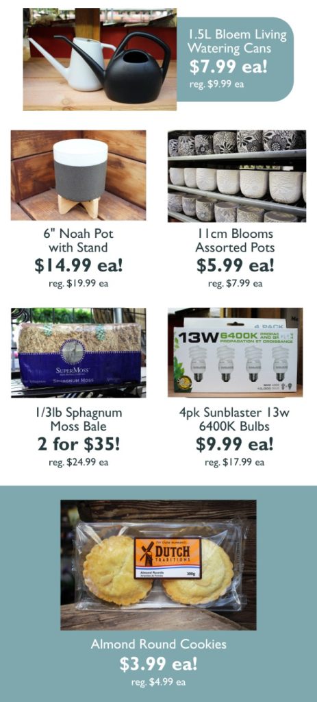 Specials Dutch Traditions Candies & Licorice 2 for $4.99! regular $3.99 each 170g Natural Pastures Mozza di Bufala $5.99 each! regular $9.99 each 150g Saltspring Island Goat Cheese - Truffle $9.99 each! regular $14.99 each DRAMM Tripod Impulse Sprinkler $74.99 each! regular $99.99 each 2L Stackable Watering Can $2.99 each! regular $3.99 each Holland Greenhouse Telescopic Hedge Shears $29.99 each! regular $39.99 each *E&OE Excepted*All Weekly Specials are subject to store availability.